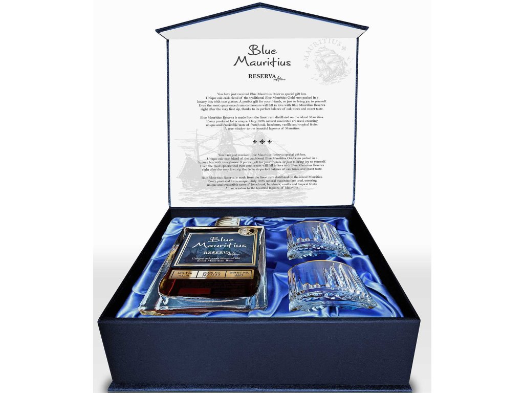 Při procesu mixování se používají pouze přírodní maceráty, které zajišťují jedinečnou a neodolatelnou chuť. I ti nejzkušenější rumoví znalci si Blue Mauritius Reserva zamilují hned po prvním doušku díky dokonale vyváženým dubovým tónům a jemně nasládlé chuti lískových oříšků, vanilky a tropického ovoce.