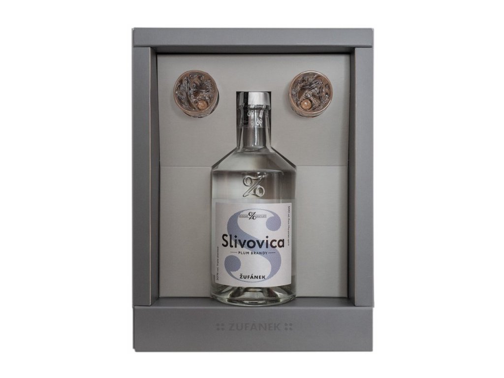 Dárková kazeta ve stříbrné barvě se Slivovicí Žufánek 50% 0,5l doplněná o dvě skleničky z prvotřídního křišťálového skla ze slavných českých skláren Crystalite Bohemia. Krabičku uzavírá tmavě šedý pevný návlek.