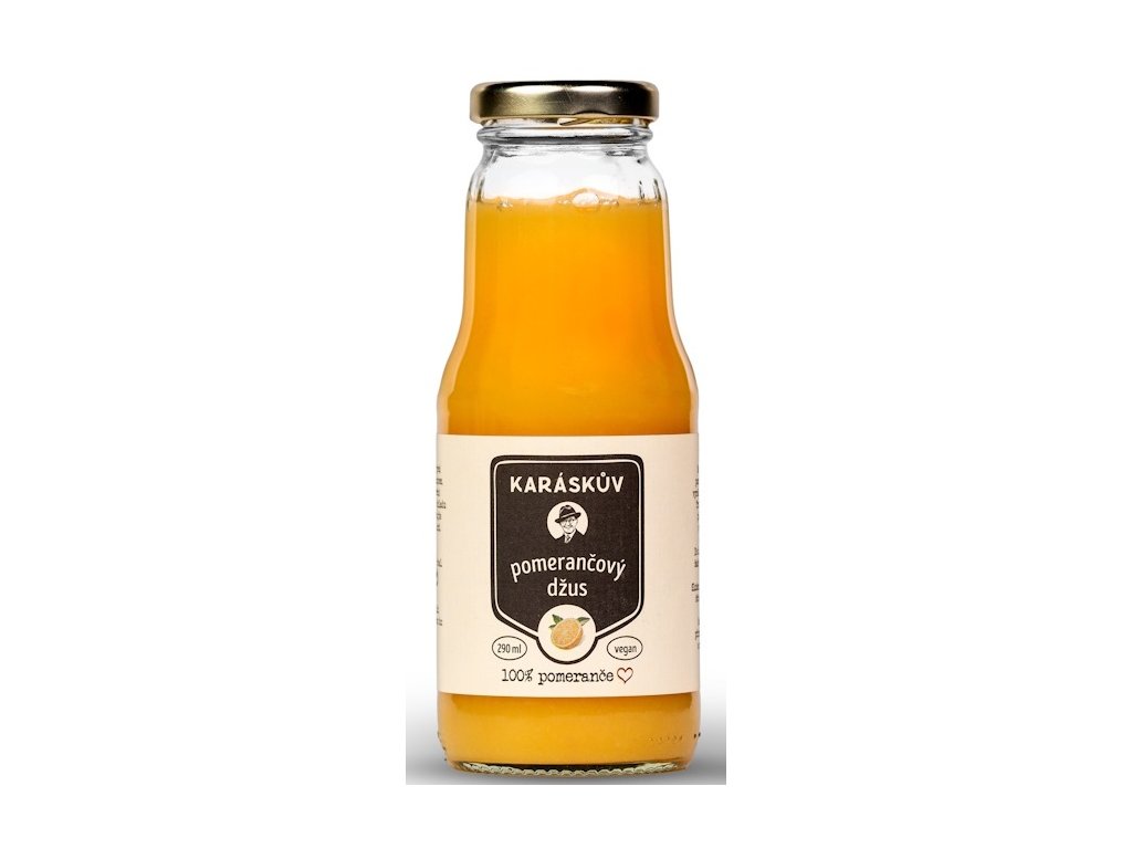 Karáskova Limonáda Pomerančový Džus 100% . Tohle je pomerančová óda na radost. Nic než 100% pomeranč, pěkně uzrálý, návykově sladký a zároveň citrusově šťavnatý a kyselý. Úžasný.