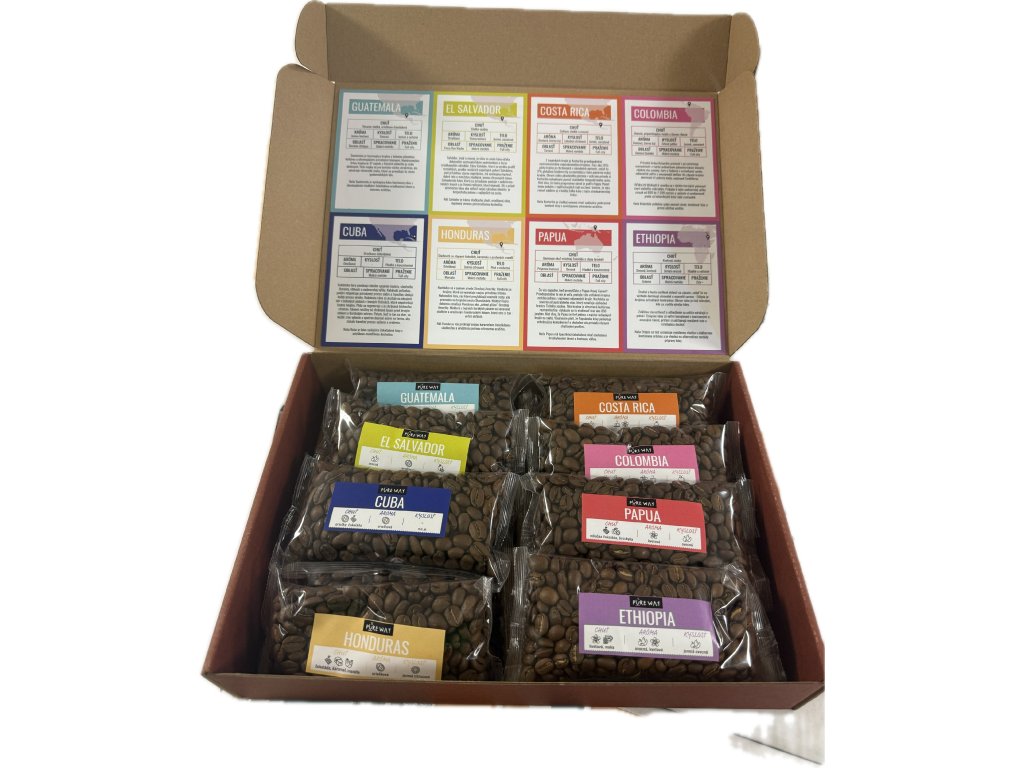 Objevte kouzlo výběrové kávy s naší exkluzivní degustační sadou, která obsahuje 8 druhů 100 % Arabiky (po 100 g každá (2x50g)) z nejlepších kávových oblastí světa – ideální jako dárek či pro průzkum kávového světa přímo u vás doma.