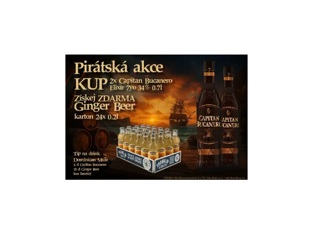 Capitan Bucanero Elixir PROMOSET 06/26 obsahuje 2x Capitan Bucanero Elixir 34% 0,7l, 24ks Franklins Sons Ginger Beer 0,2l