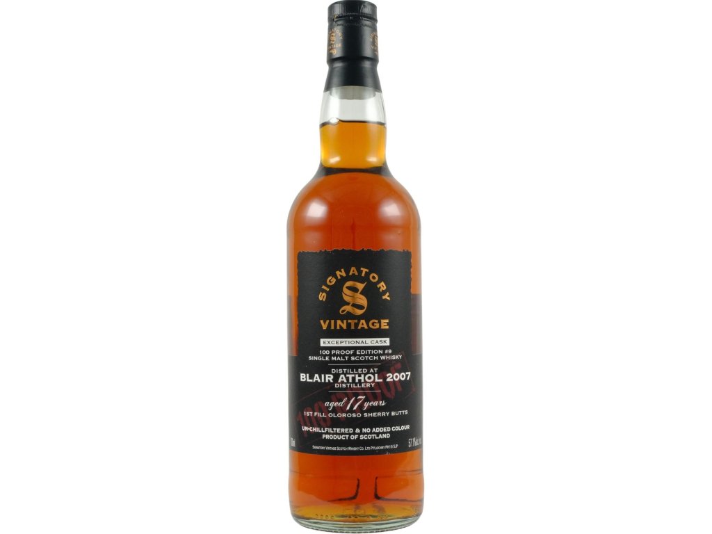 - Signatory Vintage Blair Athol 2007 (100 Proof Exceptional Cask Edition) je vysoce ceněná 17letá skotská single malt whisky z oblasti Highland, lahvovaná v roce 2025 v sudové síle 57,1 %