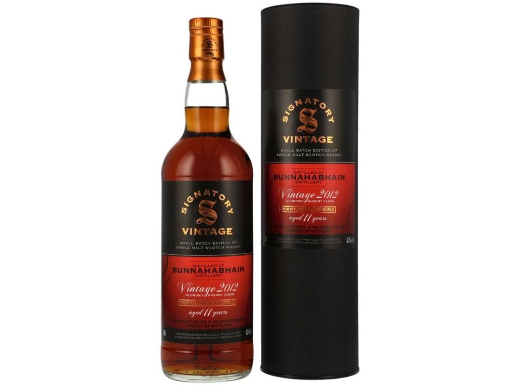 - Toto vydání Bunnahabhain 2012 (11letá) ze série Small Batch Edition #7 od nezávislého lahvovatele Signatory Vintage je vysoce hodnocená skotská whisky z ostrova Islay, která zrála v sudech po sherry Oloroso.