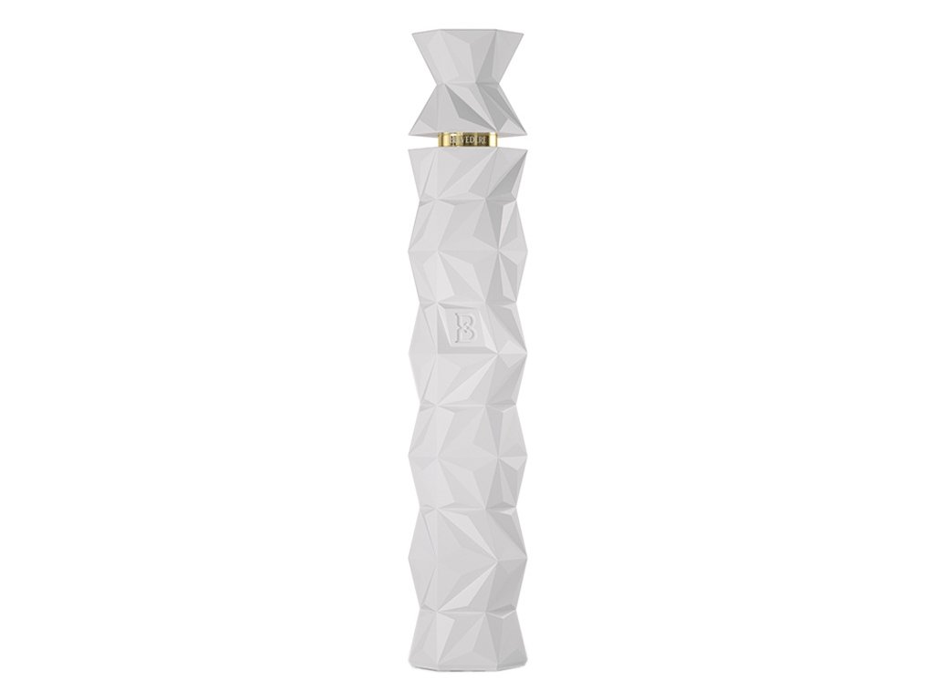 Design lahve: Moderní ikona brutalistické elegance – bílá lahev s deseti facetami symbolizuje desetistupňový proces výroby a čistotu samotného destilátu.